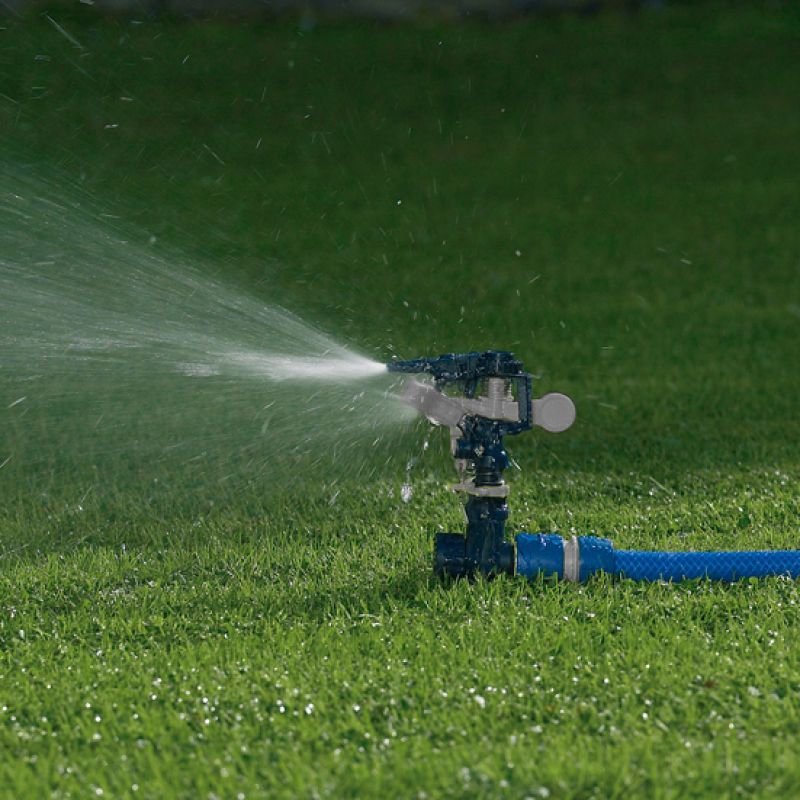 Riega grandes extensiones de forma eficaz y sin esfuerzo. Este aspersor de impulso distribuye el agua a larga distancia, ideal para jardines amplios o zonas verdes que requieren un alcance superior. Ofrece una cobertura de hasta 450 m² con un caudal de 15 litros por minuto, funcionando de manera óptima a 3 bares de presión. Su pincho garantiza una fijación estable en el suelo y el conector universal permite una conexión rápida y segura para un riego continuo y fiable.