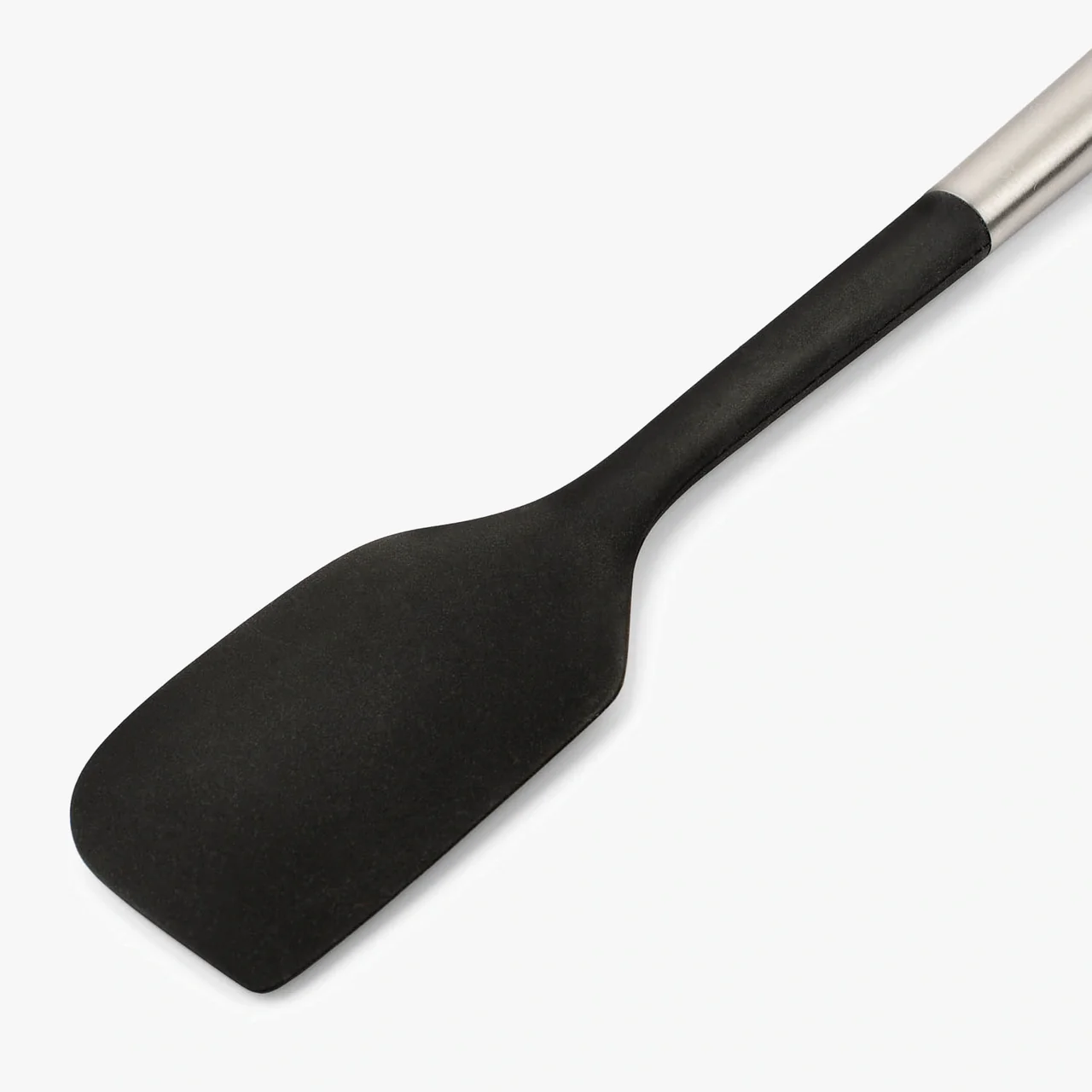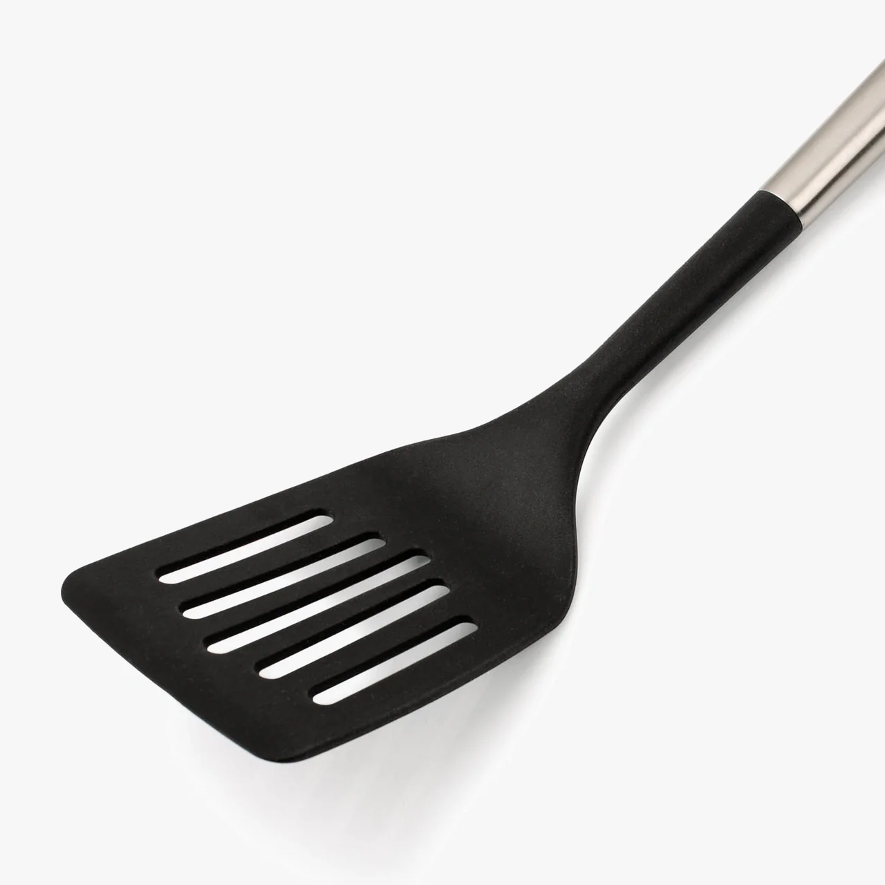 Espátula ranurada de acero inoxidable y silicona 339 mm. Ideal para voltear tortillas, manipular carnes y servir alimentos. Resistente al calor y fácil de limpiar.