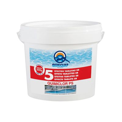 Quimiclor PS 5 Efectos Tabletas SB de 250 gramos cloro tabletas de disolución lenta. Estas tabletas combinan el efecto desinfectante, anti-algas, floculante, antical y mantenedor del pH, siendo especial para el tratamiento de piscinas con aguas muy duras o difíciles.